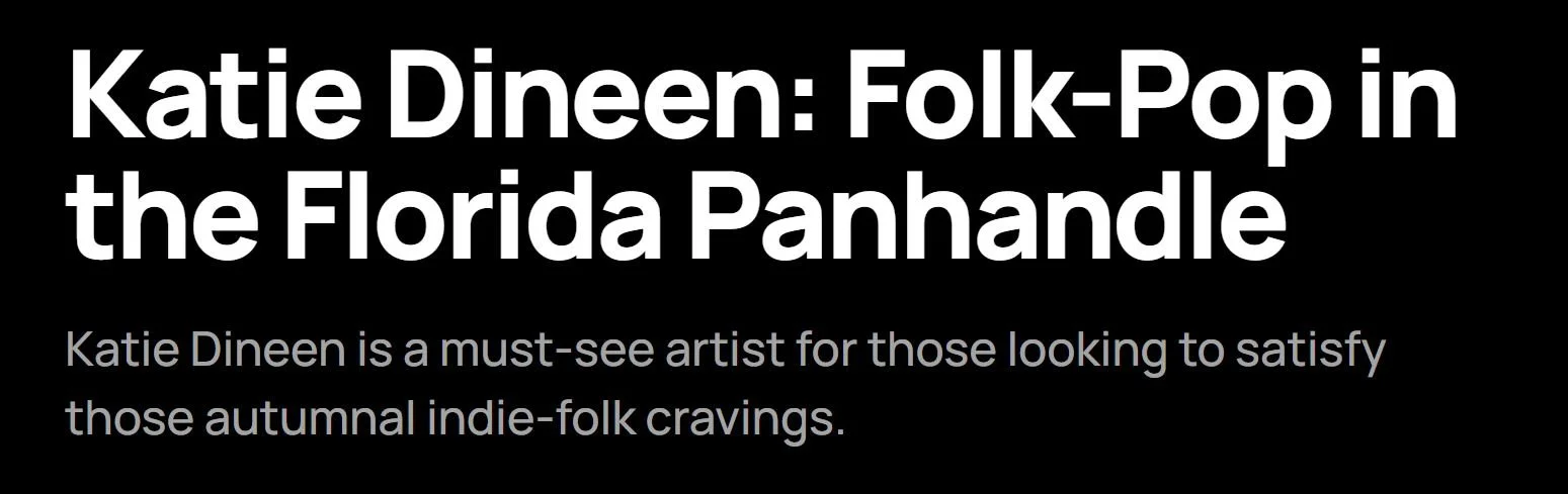 Katie Dineen has been playing music since childhood, first learning classical piano before picking up guitar and veering toward folk and indie-rock as a teenager. In her early twenties, Katie began hosting a weekly open mic, which was her catalyst to start songwriting. As her relationship with songwriting deepened, her desire to cultivate a commmunity around it took form: in 2022, she founded the Pensacola Songwriter Rounds, a monthly show series intended to grow the Pensacola songwriter scene by providing a stage for songwriters to share their music, be mutually inspired, and collaborate with one another.